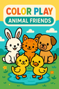 For a digital coloring book for kids, featuring cute characters, figures, shapes and animals (such as rabbit, cat, puppy, duck), colorful background, fun fonts, and friendly design.